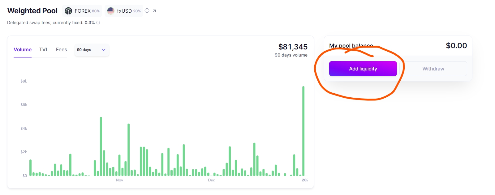 FOREX持有者将他们的FOREX + fxUSD存入Balancer fxUSD/FOREX (20/80)流动性池,为协议提供流动性,作为回报,他们将获得一个Balancer Pool Token (BPT)