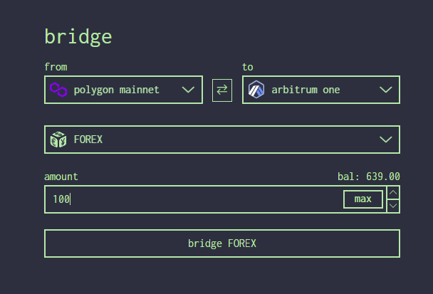 4. select the token you want to bridge and enter the amount - in this case we will bridge 100 $FOREX&#x20;