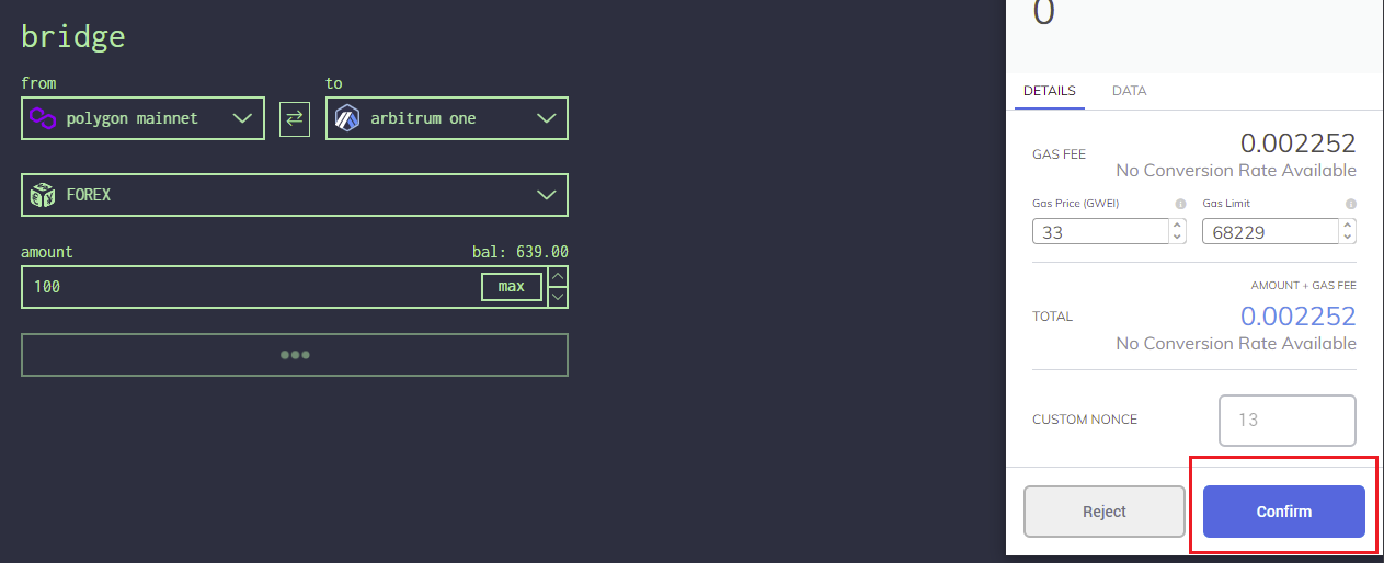 5. select **'bridge FOREX'** button and confirm the tx.