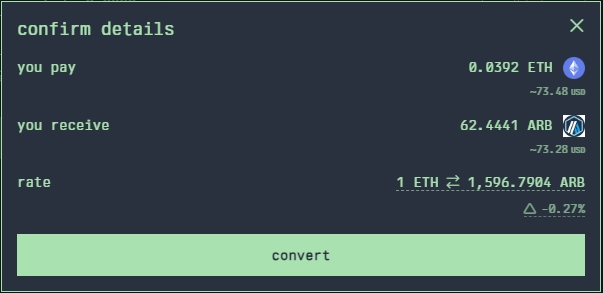 after choosing which asset to convert out of then you need to select which asset to convert into. in a similar way you can choose any asset listed on arbitrum to convert into.