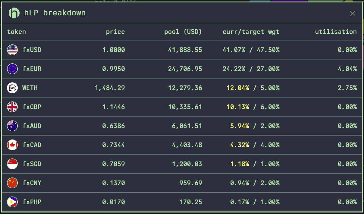 <table><thead><tr><th width="322">승인된 자산</th><th>목표 가중치</th></tr></thead><tbody><tr><td>ETH</td><td>5.0%</td></tr><tr><td><span data-gb-custom-inline data-tag="emoji" data-code="1f1fa-1f1f8">🇺🇸</span> fxUSD</td><td>47.5%</td></tr><tr><td><span data-gb-custom-inline data-tag="emoji" data-code="1f1ea-1f1fa">🇪🇺</span> fxEUR</td><td>27.0%</td></tr><tr><td><span data-gb-custom-inline data-tag="emoji" data-code="1f1ef-1f1f5">🇯🇵</span> fxJPY</td><td>2.0%</td></tr><tr><td><span data-gb-custom-inline data-tag="emoji" data-code="1f1ec-1f1e7">🇬🇧</span> fxGBP </td><td>6.0%</td></tr><tr><td><span data-gb-custom-inline data-tag="emoji" data-code="1f1e8-1f1e6">🇨🇦</span> fxCAD</td><td>4.0%</td></tr><tr><td><span data-gb-custom-inline data-tag="emoji" data-code="1f1e6-1f1fa">🇦🇺</span> fxAUD</td><td>2.0%</td></tr><tr><td><span data-gb-custom-inline data-tag="emoji" data-code="1f1e8-1f1f3">🇨🇳</span> fxCNY</td><td>2.0%</td></tr><tr><td><span data-gb-custom-inline data-tag="emoji" data-code="1f1e8-1f1ed">🇨🇭</span> fxCHF</td><td>1.5%</td></tr><tr><td><span data-gb-custom-inline data-tag="emoji" data-code="1f1f8-1f1ec">🇸🇬</span> fxSGD</td><td>1.0%</td></tr><tr><td><span data-gb-custom-inline data-tag="emoji" data-code="1f1f0-1f1f7">🇰🇷</span> fxKRW</td><td>1.0%</td></tr><tr><td><span data-gb-custom-inline data-tag="emoji" data-code="1f1f5-1f1ed">🇵🇭</span> fxPHP</td><td>1.0%</td></tr></tbody></table>