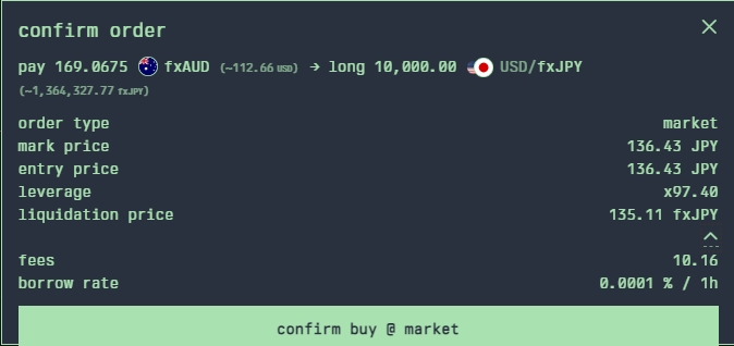 在继续按下买入/卖出@市场价格后,您将看到一个确认弹出窗口。确认交易详情无误后,确认交易,您的交易就会被下单。