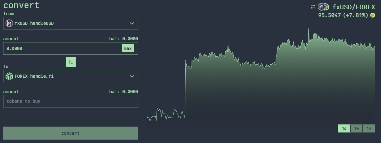 또한 Arbitrum의 balancer 에서 fxUSD로, Gate.io에서 USDT로 구입할 수도 있습니다. FOREX는 Ethereum 메인넷의 Uniswap 및app.handle.fi/convert 에서도 사용할 수 있지만 유동성이 제한되어 있어 슬리피지가 증가할 수 있습니다.
