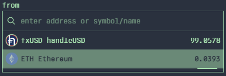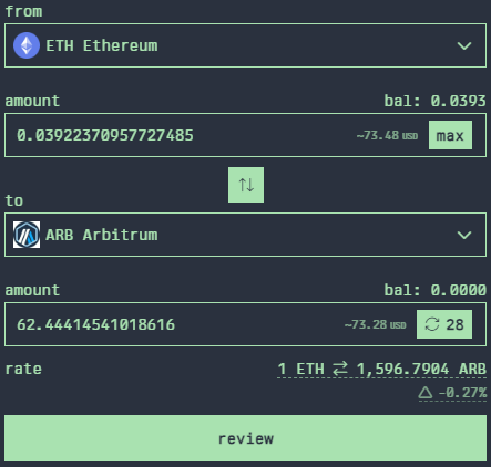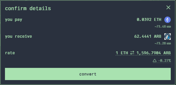 select which asset you wish to convert from. the dropdown menu will include all the tradable assets in your wallet and include balance details. through the search box you are able to view or get pricing on any asset listed on arbitrum by entering the token address, symbol or name.