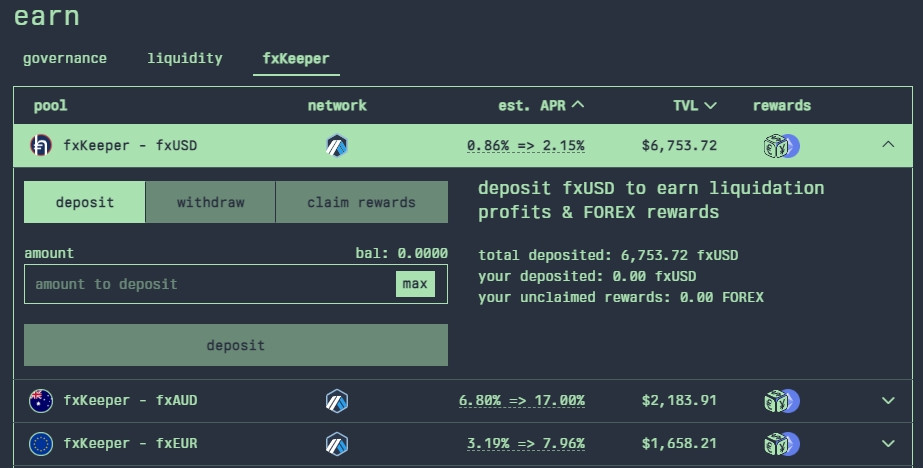 staking is single sided, so there no risk of impermanent loss, and depositors receive both a share of liquidation profits and FOREX rewards. a step by step approach to providing fxKeeper pool liquidity and earn $FOREX rewards: