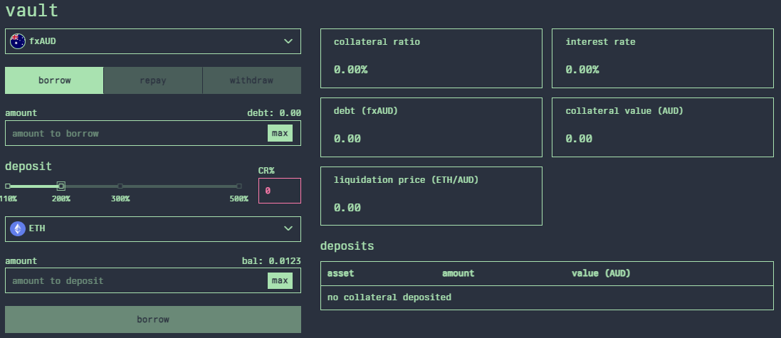 once an amount of fxToken is selected then your c-ratio will update and any additional collateral required to achieve the minimum c-ratio of 200% will displayed below. the price and value of the required collateral in the denomination of the fxToken will also be displayed.
