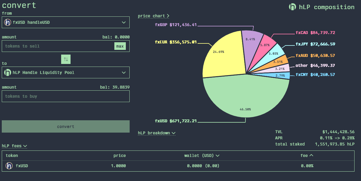 3. **select handle Liquidity Pool - hLP** then **select deposit** which will direct you to a convert page where hLP is the destination of the transaction. On this screen you can also view what hLP is currently made up of and if you view the hLP breakdown then the utilisation & current/ target weights are provided. more on the mechanics of hLP are available [here](https://docs.handle.fi/the-platform/handle-liquidity-pool-hlp).