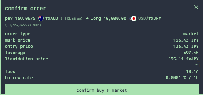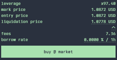 청산 가격: 이는 담보 금액이 거래 손실에 거의 동일해지는 가격입니다. 당신의 담보 - 손실 - 차입 수수료가 포지션 크기의 1% 미만일 때 거래는 종료됩니다. 손실과 수수료를 공제한 후 남은 담보는 계정으로 반환됩니다. 청산 매개변수에 대한 자세한 정보는 여기에서 확인할 수 있습니다.