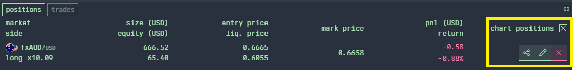 거래를 개시한 후에는 '포지션' 탭에서 거래를 표시하고 여기에서 거래를 관리할 수 있는 몇 가지 옵션을 제공합니다.