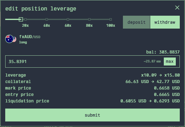 포지션 수정: 이것은 포지션 레버리지를 조정함으로써 거래의 매개변수를 조정할 수 있게 해 줍니다. 더 많은 담보를 입금하거나 출금함으로써 당신의 레버리지가 조정됩니다. 더 많은 담보를 입금하면 포지션의 레버리지가 줄어들고, 더 많은 담보를 출금하면 레버리지가 증가합니다. 창은 제안된 레버리지 변경의 세부 사항과 그것이 담보와 청산 가격에 미치는 영향을 표시할 것입니다.
