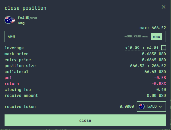 레버리지 상자: 부분적으로 종료하는 경우 기존 레버리지 비율을 유지하는 옵션이 있습니다. 이 옵션을 체크함으로써 당신은 포지션을 종료하고 해당하는 담보 금액을 출금하게 됩니다.