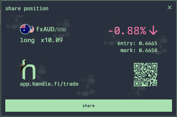 거래 공유하기: handle.fi는 이 옵션을 선택함으로써 소셜 미디어에 거래를 공유할 수 있게 해 줍니다. 이는 당신의 성취를 강조하는 이미지를 생성할 것입니다: